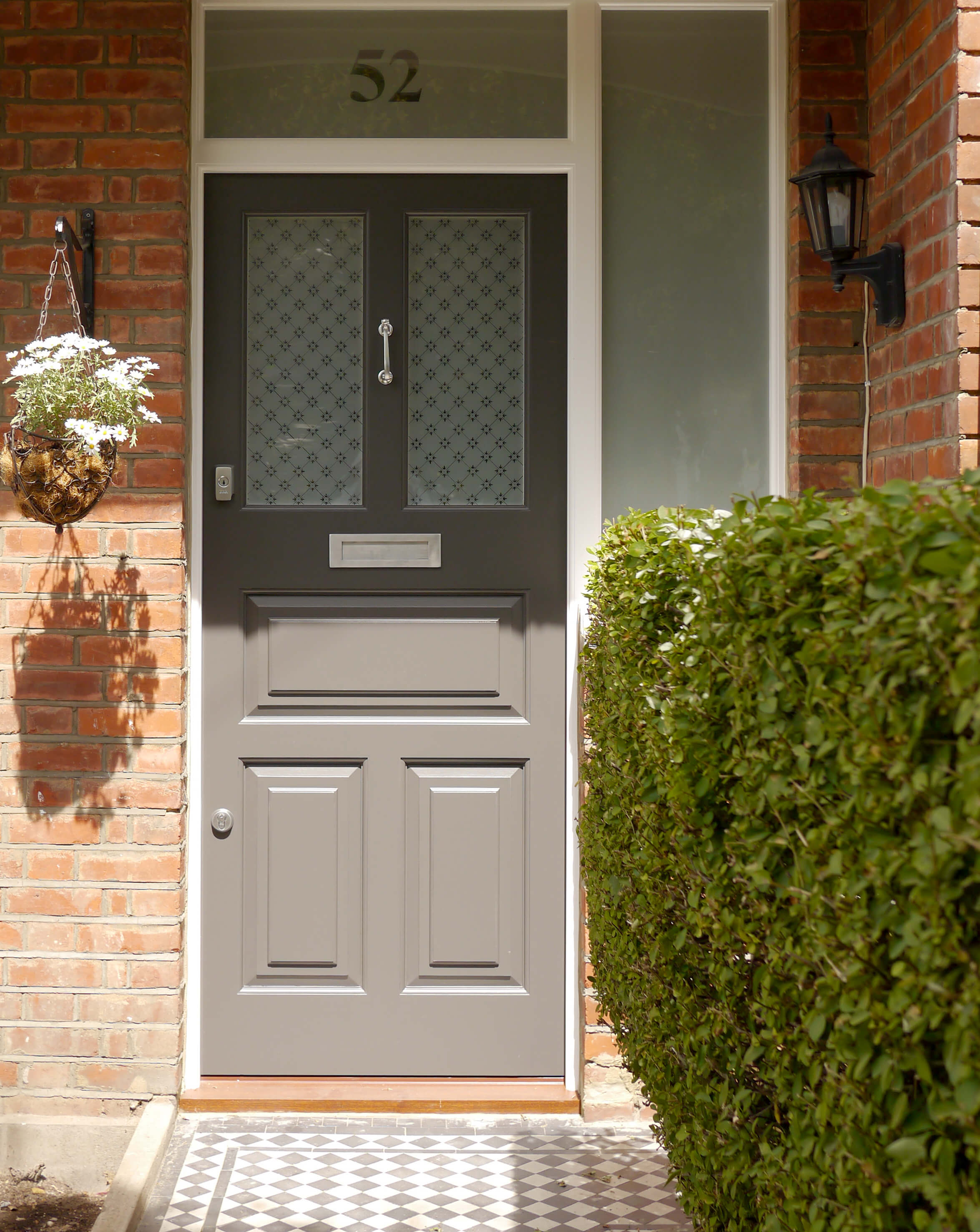 Our skilled designers have reimagined the property's Edwardian heritage with this elegant 5-panel entrance door, featuring bespoke stained glass and authentic Edwardian panels. Painted in our exclusive colour Azure, and finished with brass detailing, this front door design adds enviable kerb appeal to the property.