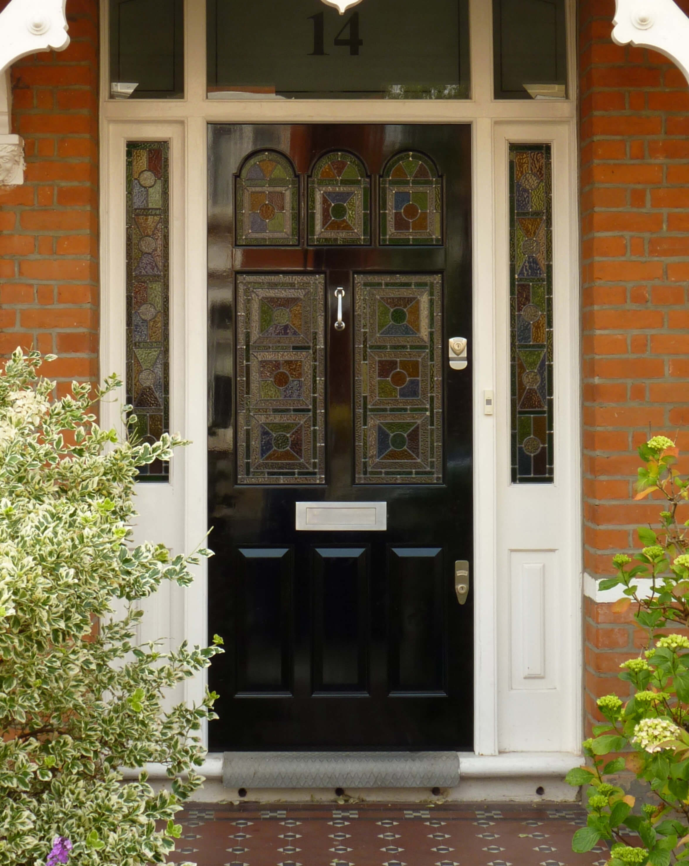 Tall Edwardian front door and frame set with opaque etched glass and finished with chrome door furniture. This door has three moulded wooden panels and two glass panels in its upper third portion – in a style that reflects Edwardian tastes. The simple etched glazing allows daylight into the hallway while the opaqueness offers extra privacy and security.