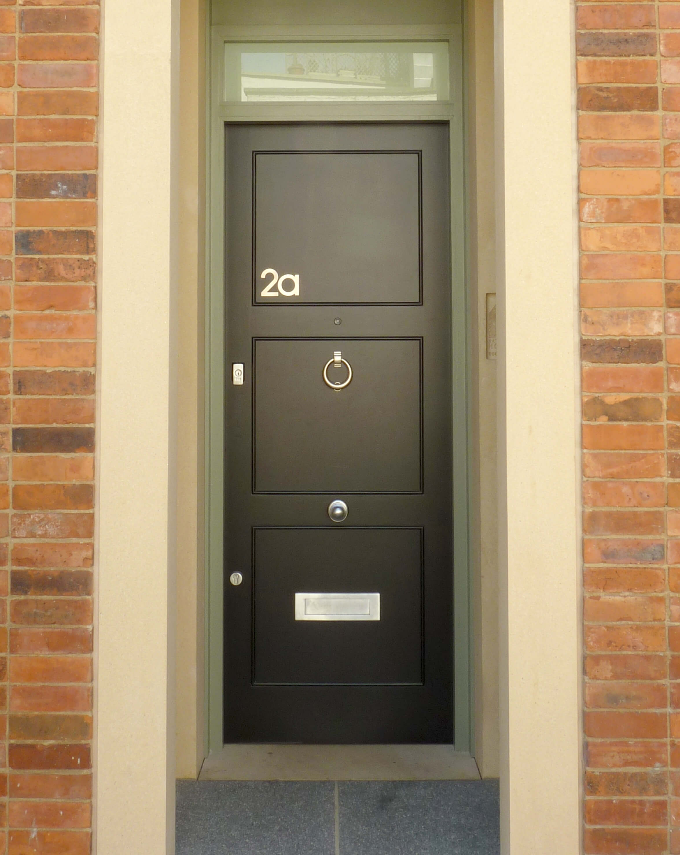 Feature door and frame with fully glazed sidelights and chrome finishes. The beauty of this door is in its quiet minimalism. The opaque glazed sidelights reinforce privacy and at the same time enhance the elegance of the door’s neutral finish. The homeowner opted for a wall-mounted letterbox to further showcase the design of the door.