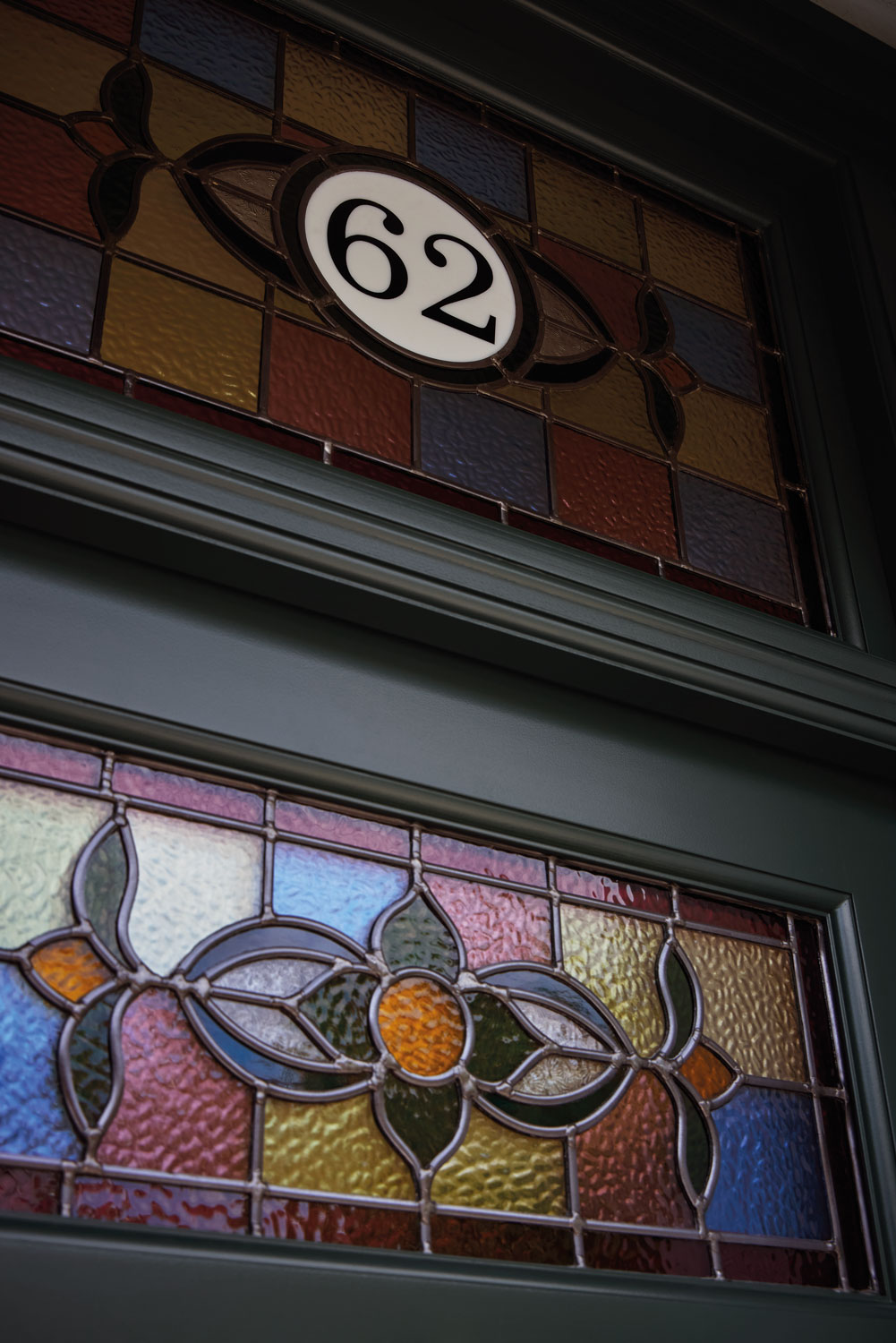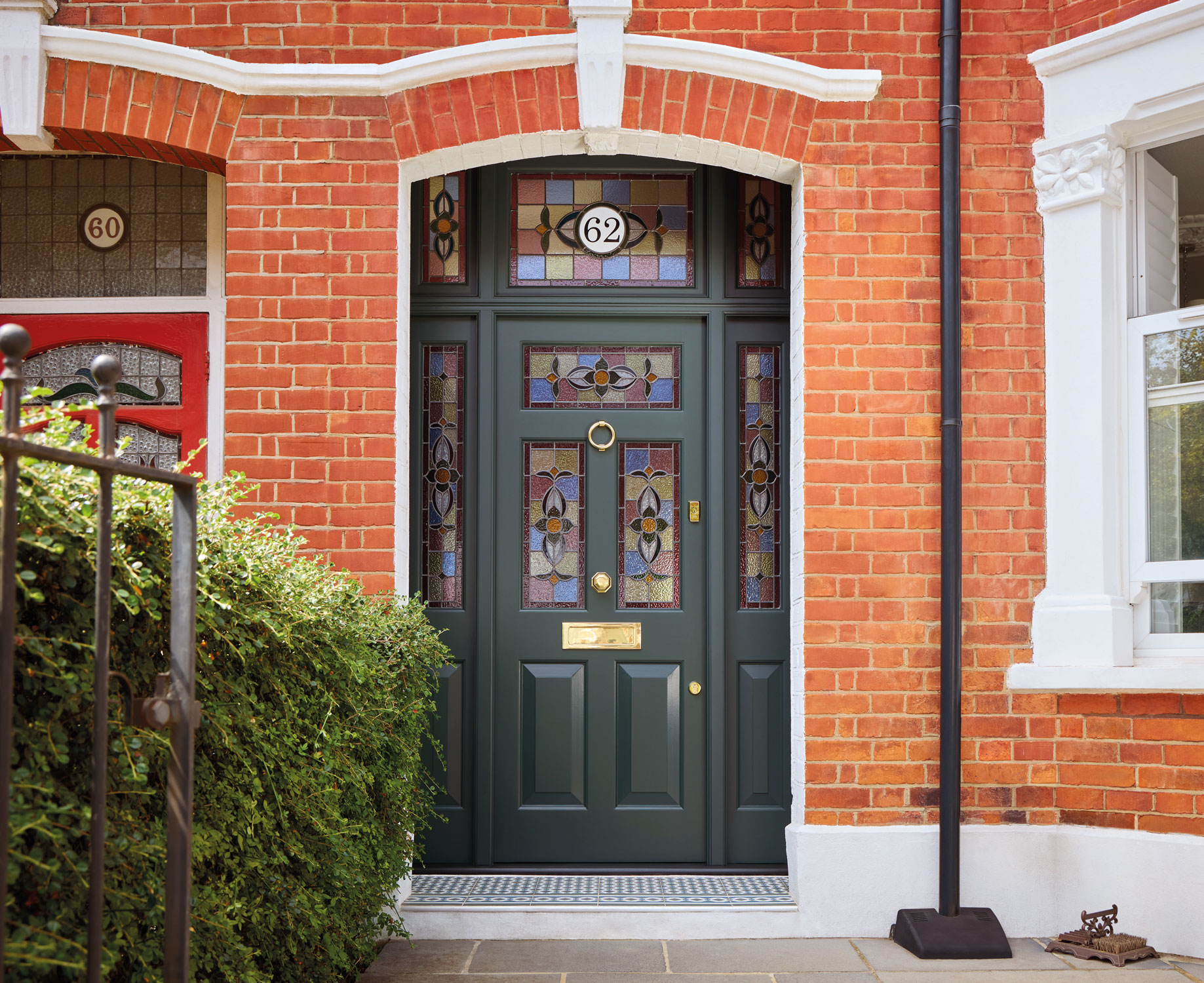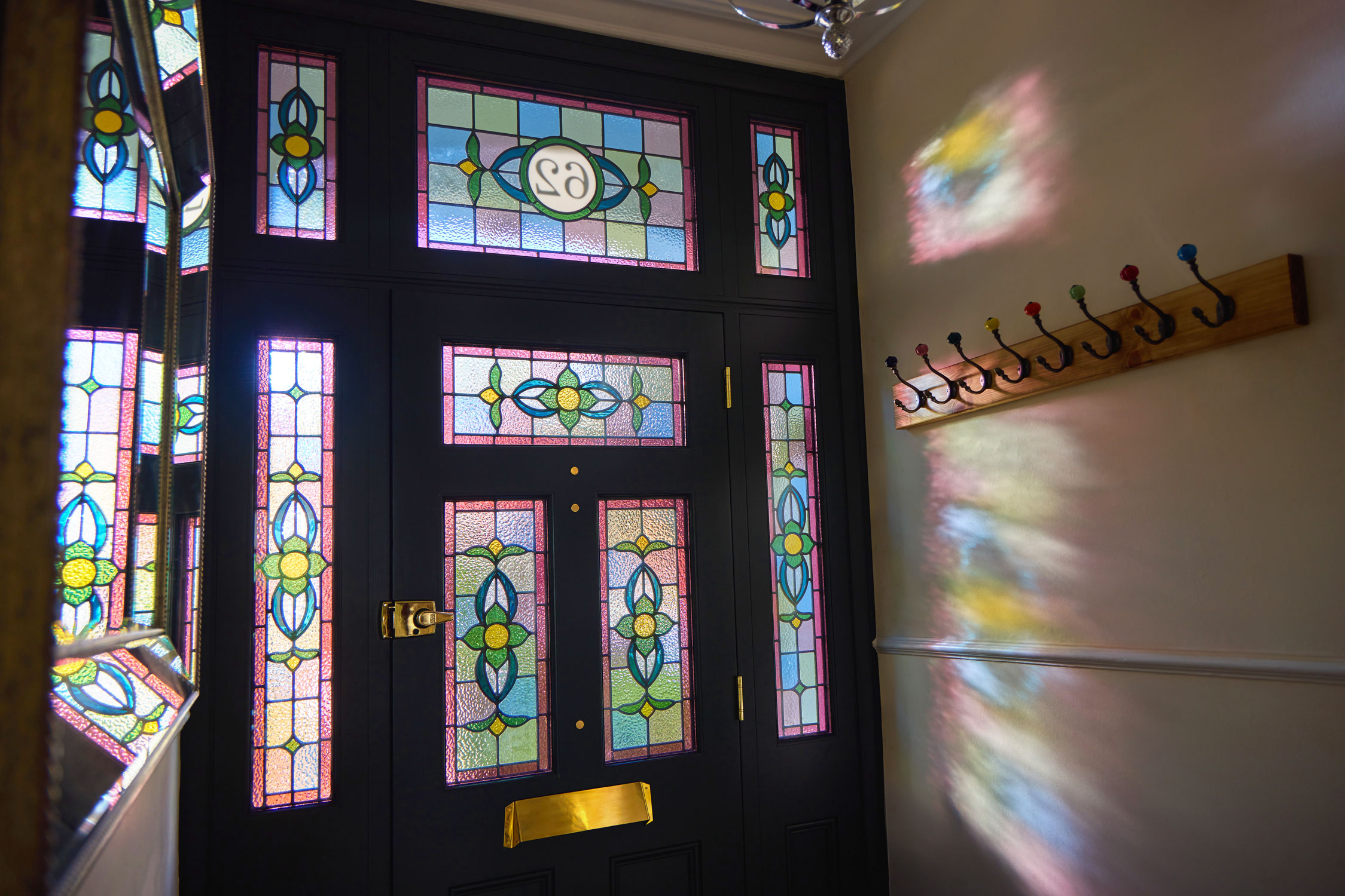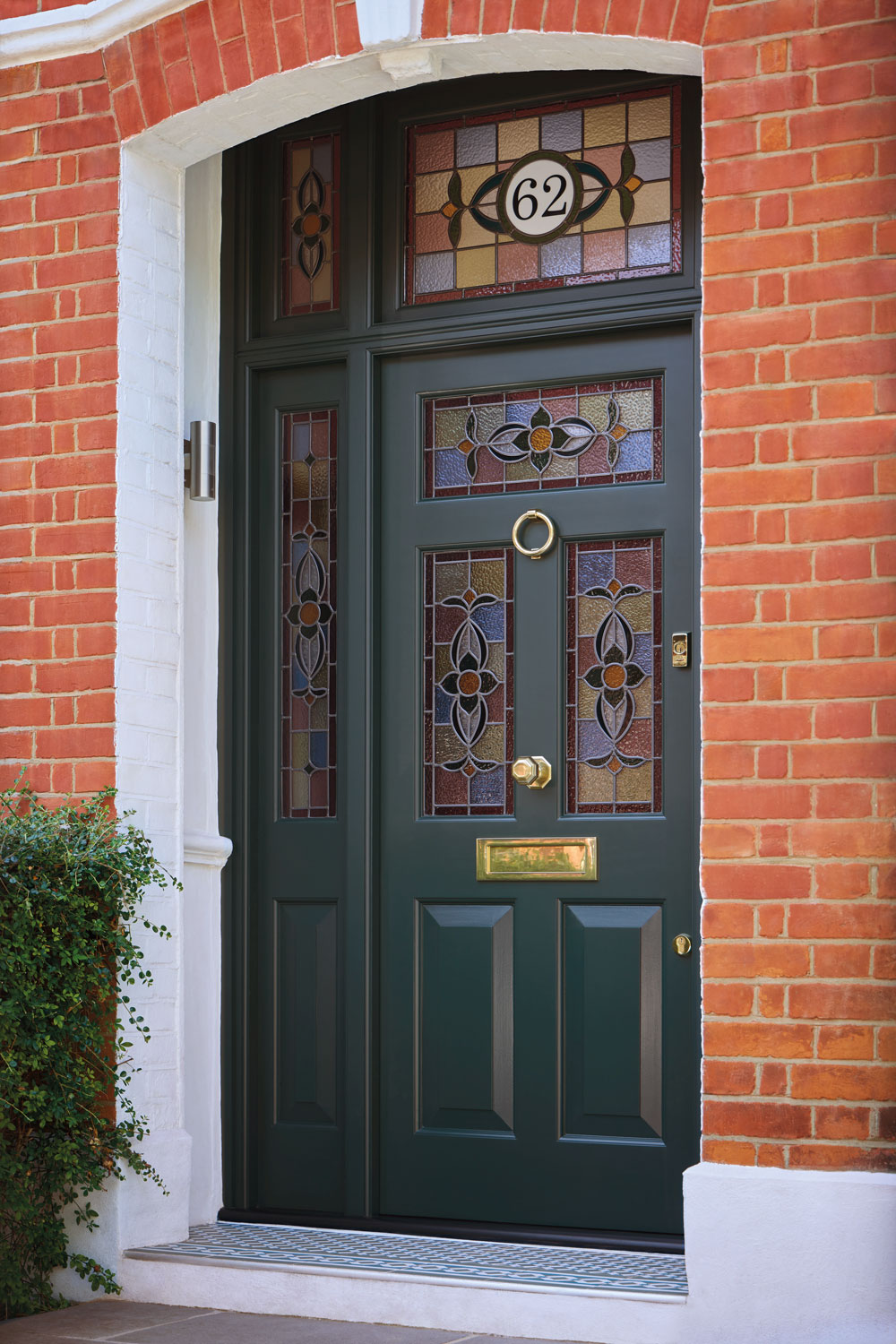 This dark green Edwardian door has transformed the entrance of our client's spectacular London home. Painted in our exclusive shade, Night Forest, a rich green colour that pairs perfectly against the authentic red brick exterior. The intricate stained glass panels complement the door's traditional and authentic design, while the polished brass door furniture adds a hint of modern sophistication.