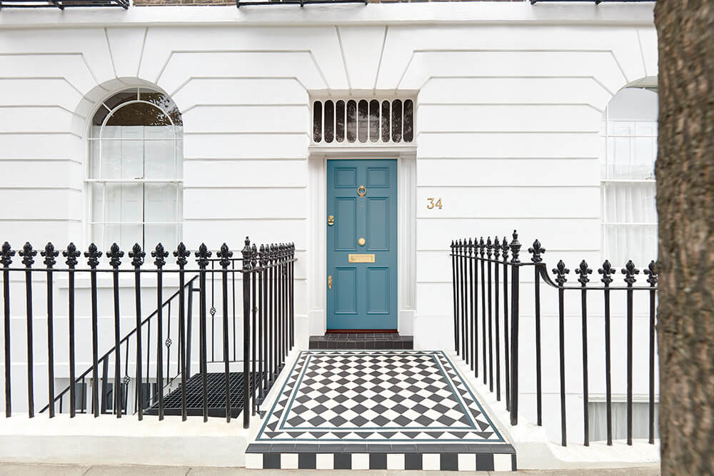 Typically, many Victorian properties can be identified by their use of intricate detailing. Between 1837 and 1901, there was a boom period of house building in the capital. As space was at a premium, the terraced home became popular. A Victorian front door is a grand affair as many people in this period would showcase their wealth and standing in the community by designing elaborate front doors – often with intricate stained glass panels and sidelights. Because the Victorians understood the power of kerb appeal, porches and doorsteps had geometric tiling which was often reflected in the paintwork of the door.