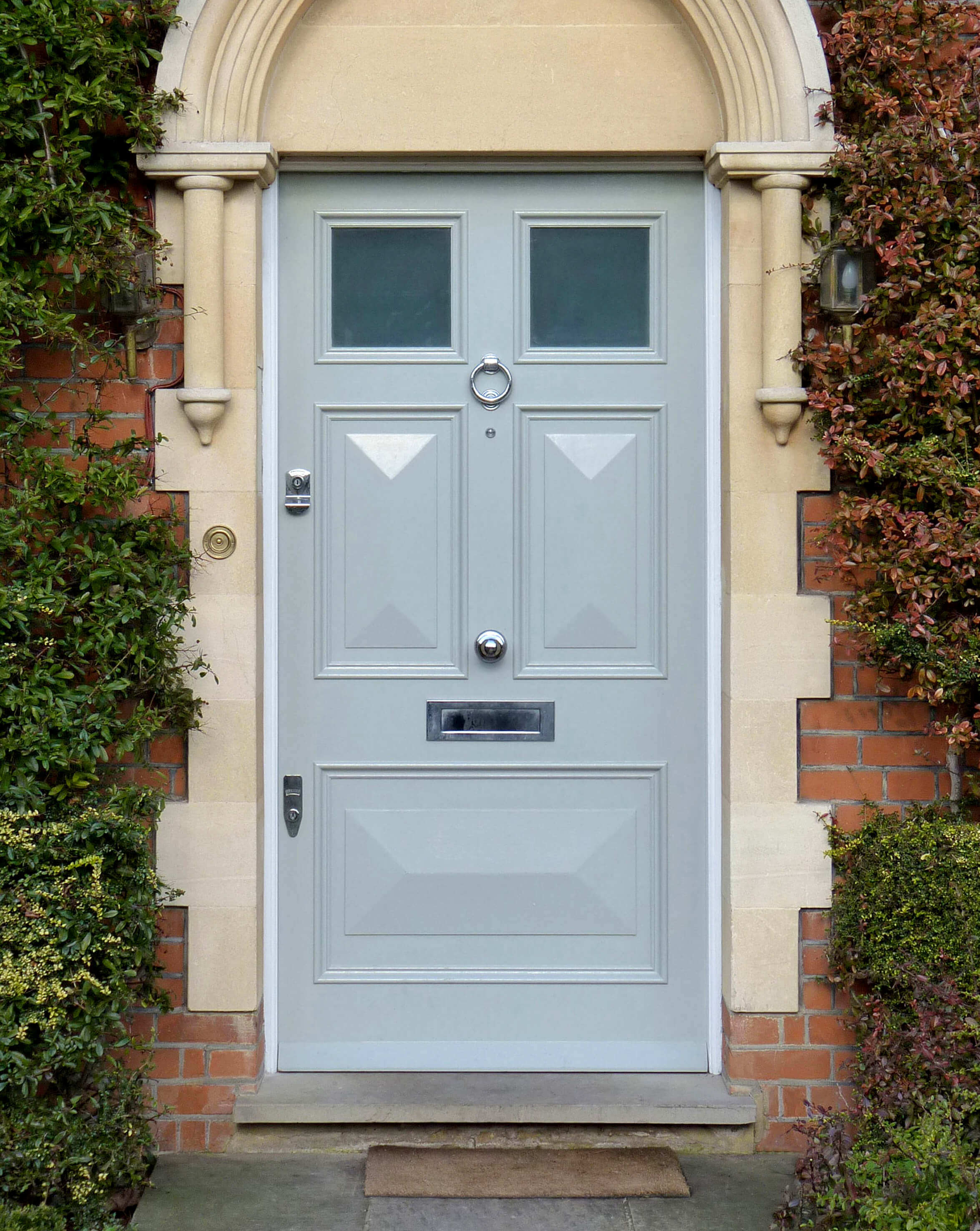 Striking Georgian front door with vertical inlaid panels, square fanlight and thoughtfully positioned door furniture. The...
