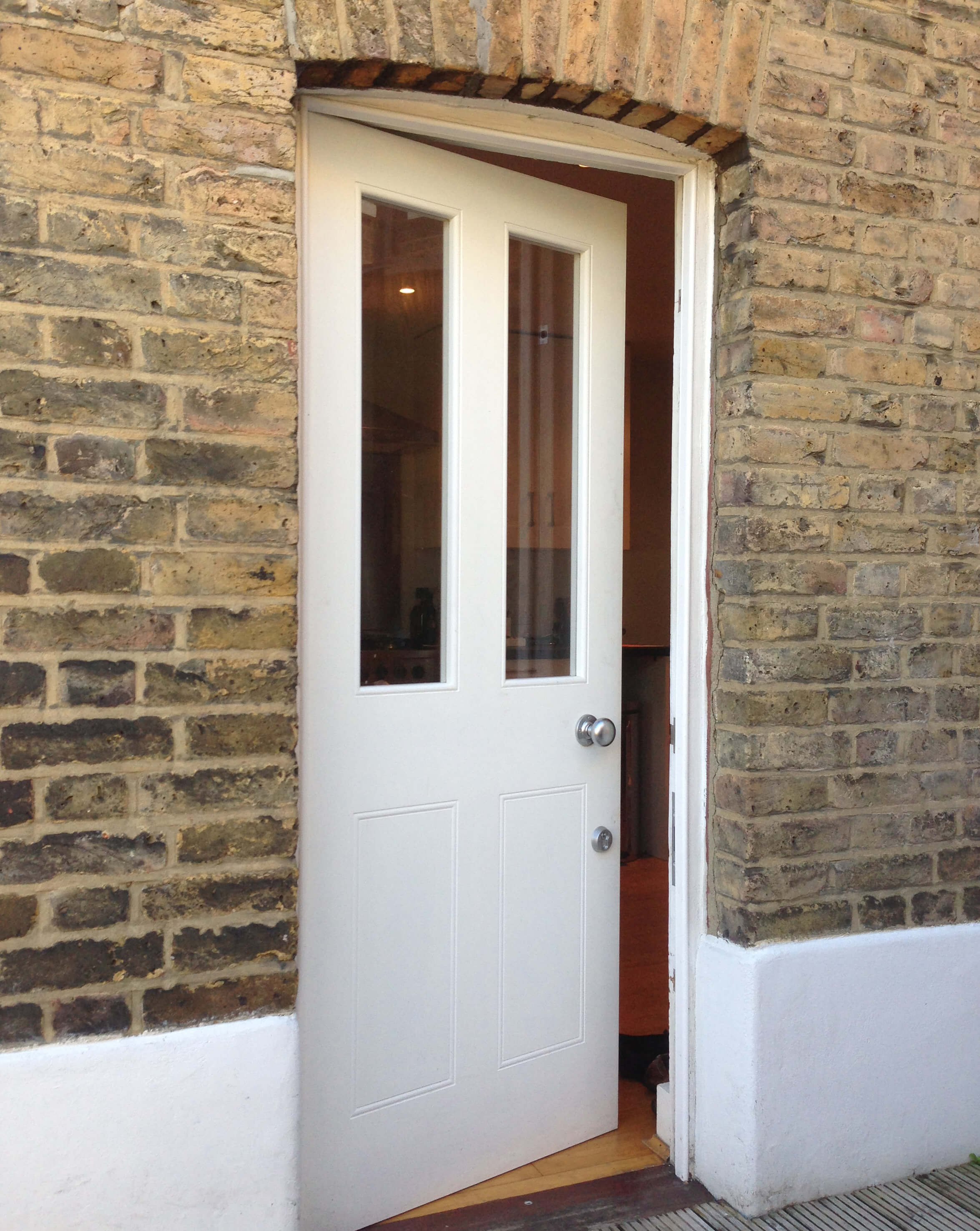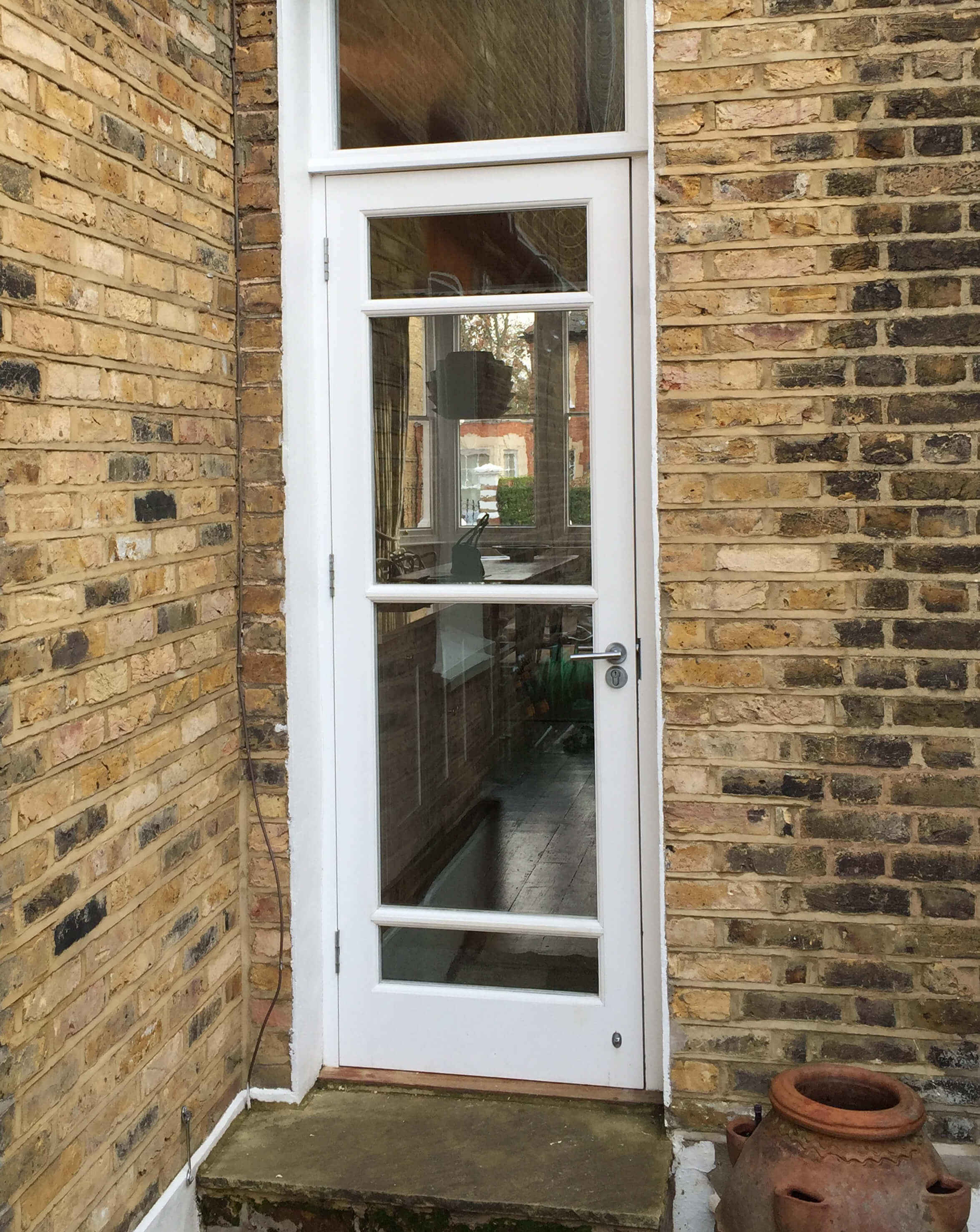 Stylish, part-glazed, four panel back door with chrome door furniture, expertly painted in white. As...