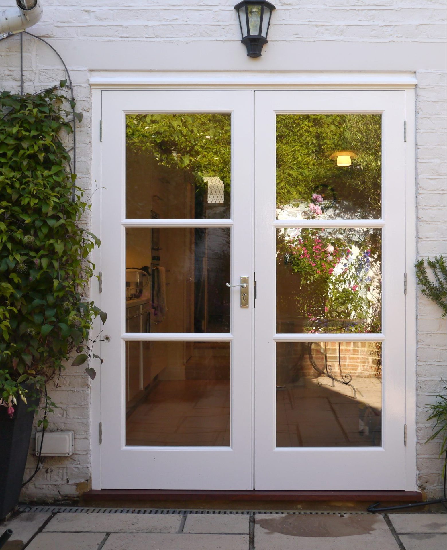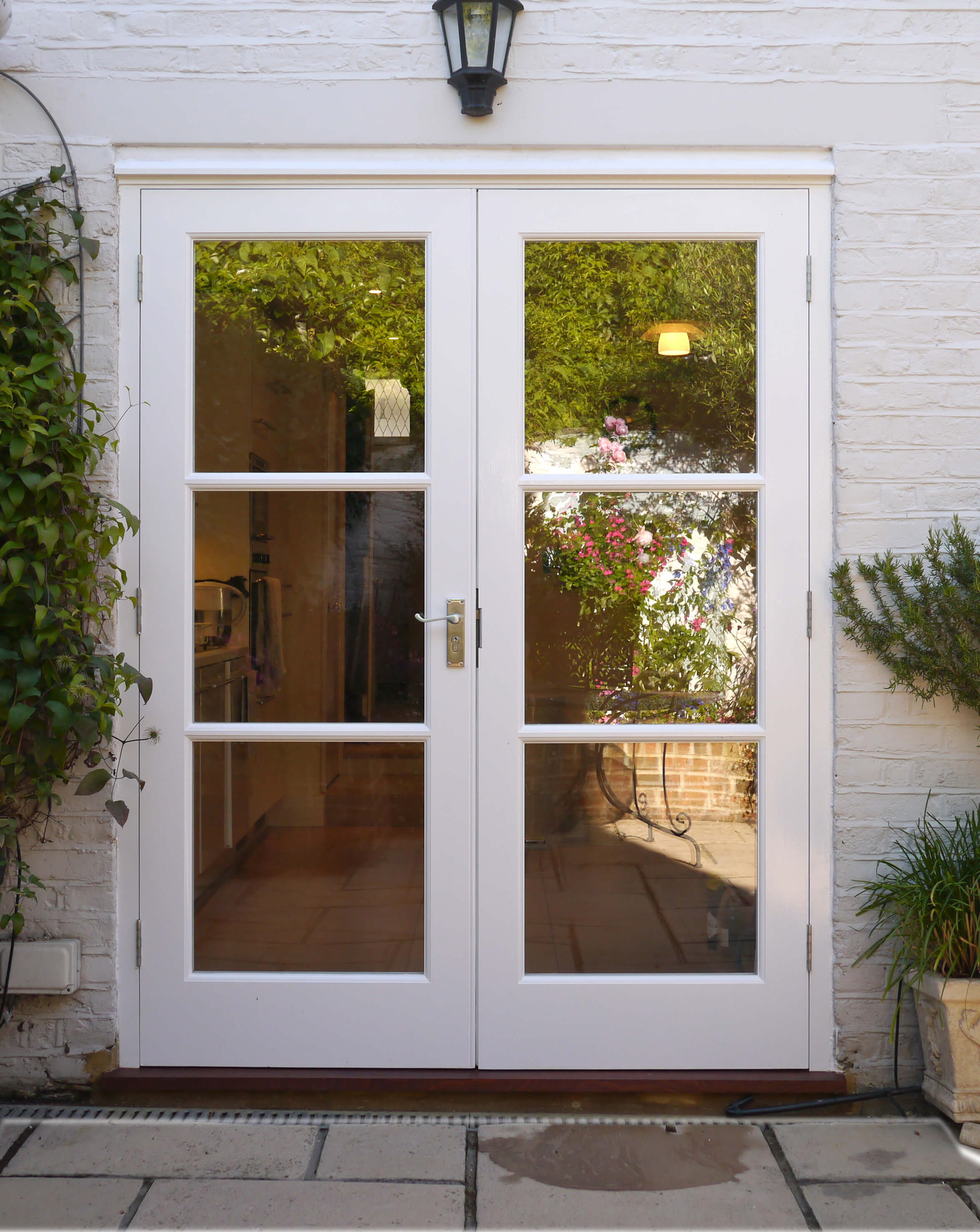 Garden doors with three glass panels in each, and solid wood frames. Finished in white...