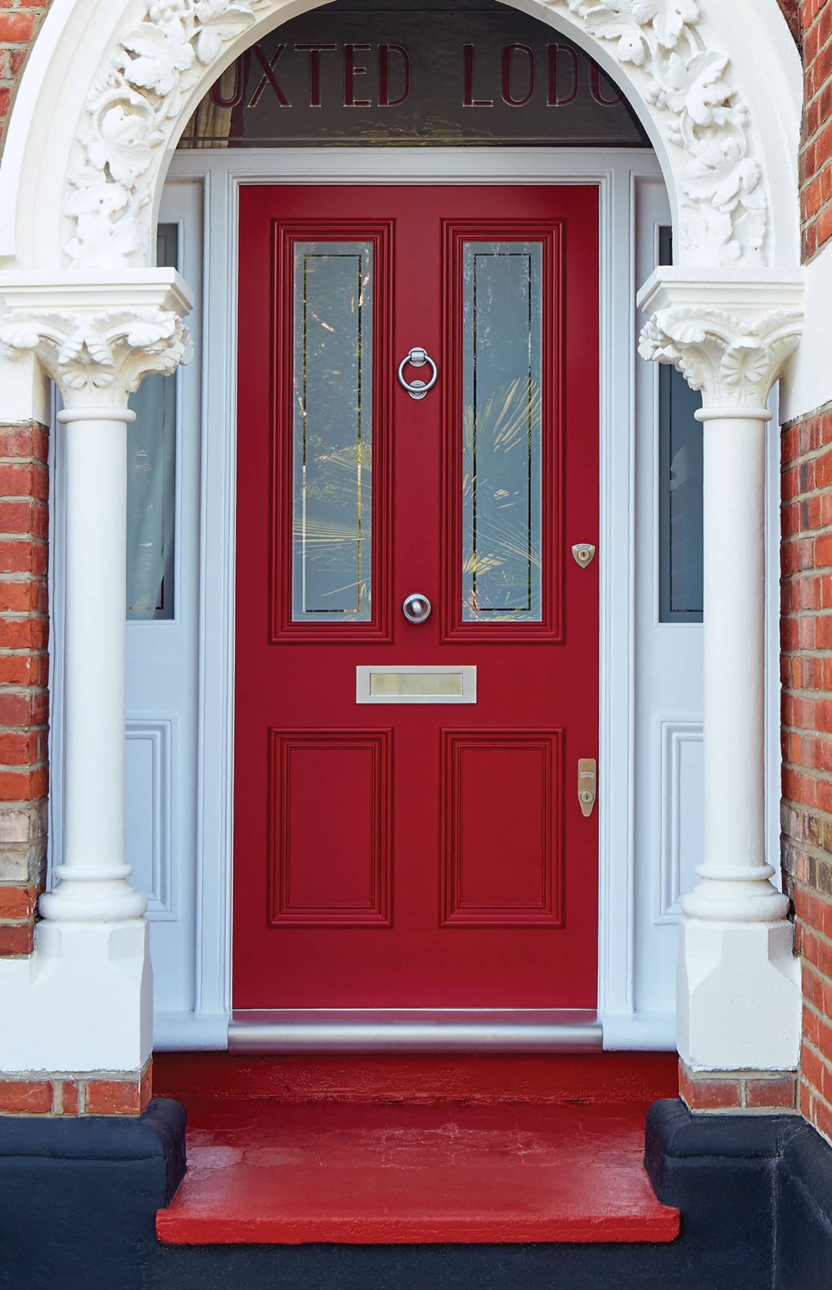 This Raspberry Red Victorian external door exudes authentic style and kerb appeal. It has opaque glazing in the upper panels and sidelights to maximise light flow into the home while maintaining plenty of privacy. The classic colour of this handsome painted door complements the original red-coloured detail in the tiled path and on the doorstep.