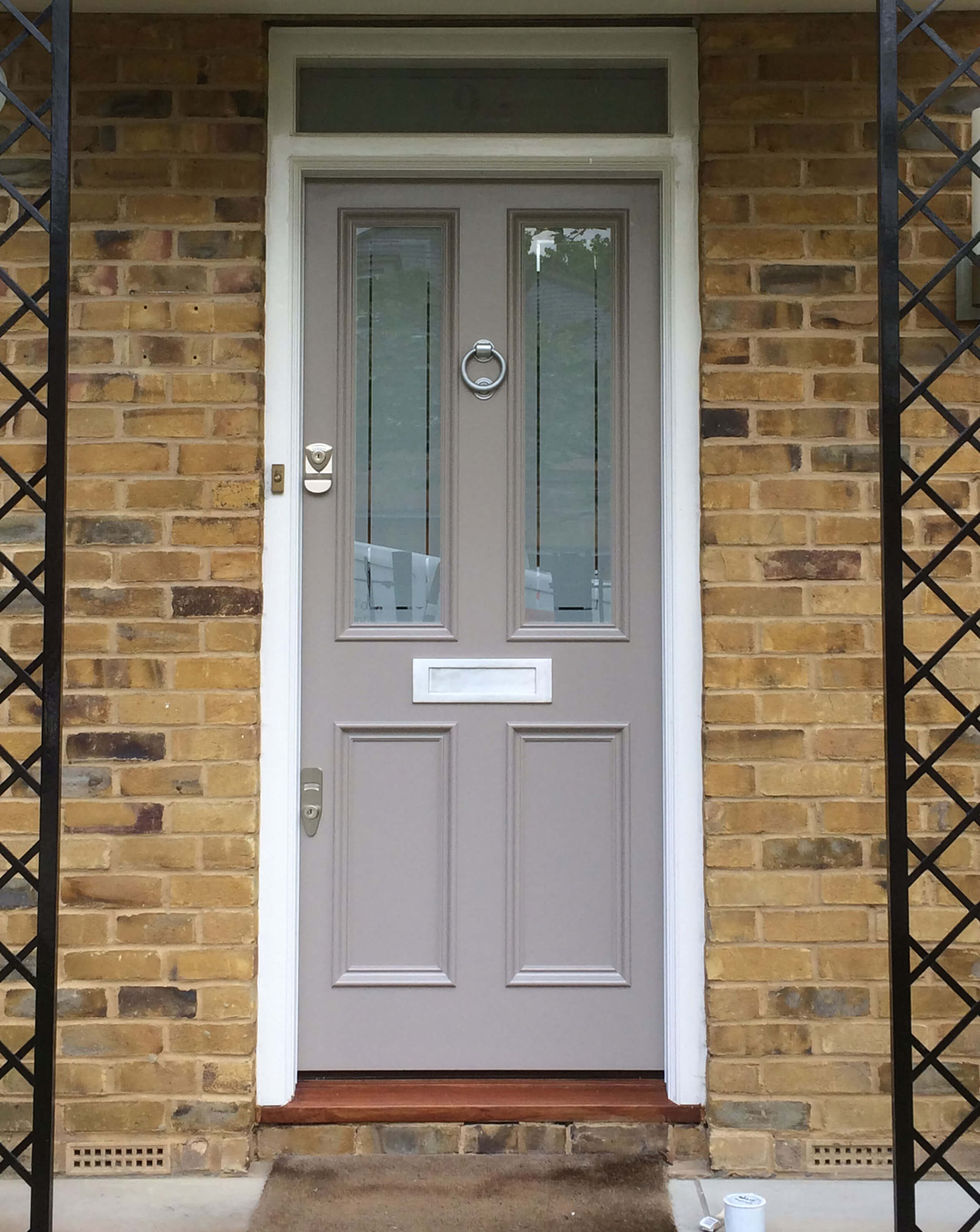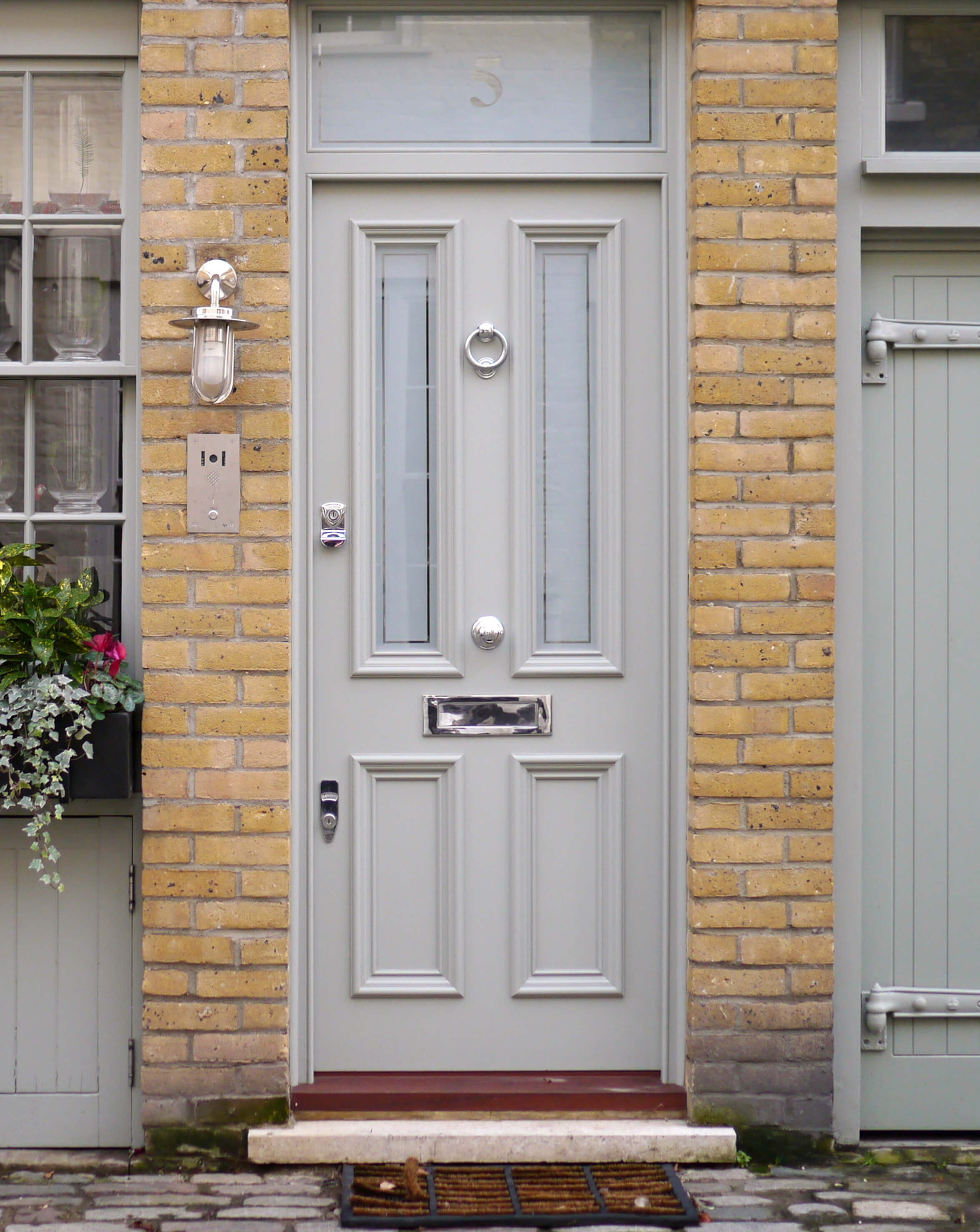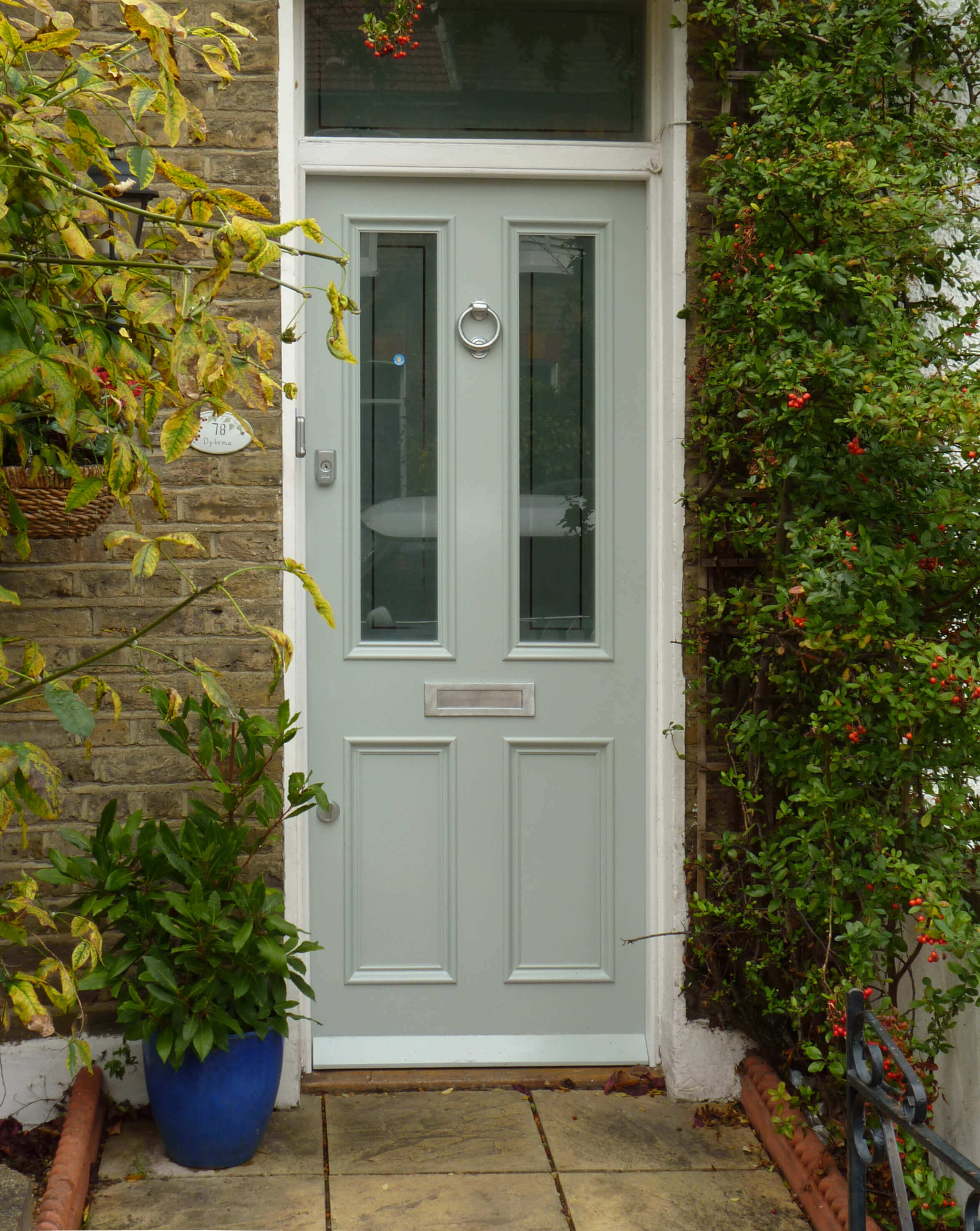 Victorian door with opaque glass panels and nickel door furniture. Finished in a colourway that is authentic to the period. To give your Victorian door a truly authentic look and feel we recommend hand-painting in a colour that was popular during the mid-late 19th century. These styles and shades are experiencing a huge revival in London right now.