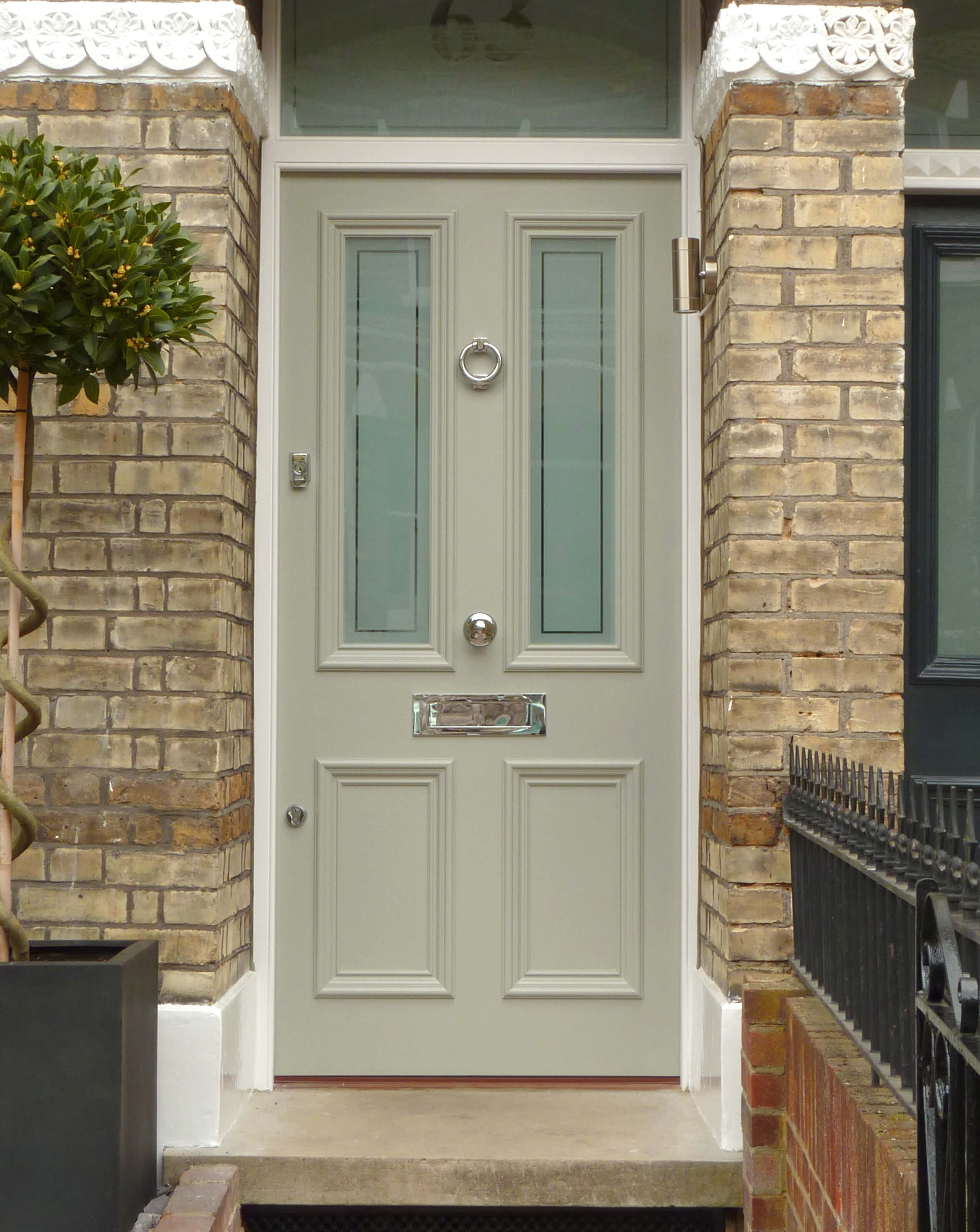 This meticulously made Victorian wood front door in a mint-coloured shade called Prussian Green has six beautifully moulded panels in keeping with its period style. The opaque fanlight has oversized door numerals etched into the glazing; the positioning of the numbers keeps the chrome plated door furniture to a minimum.