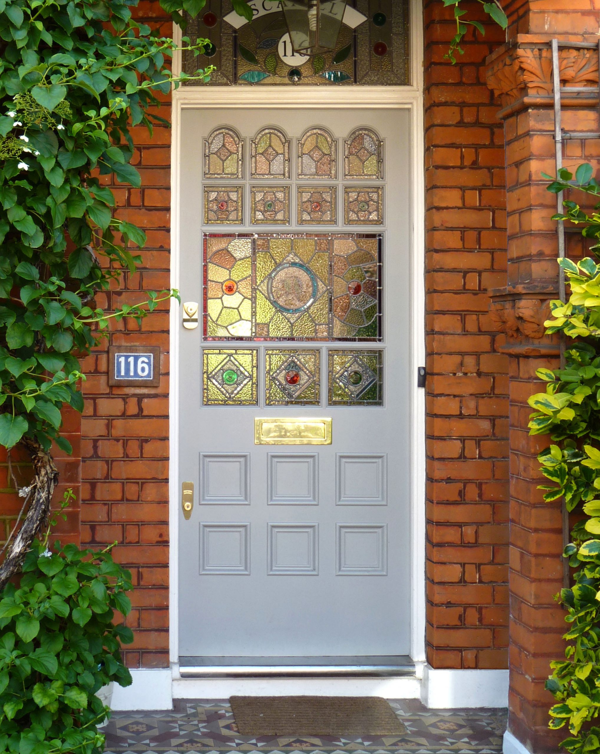 Victorian door and door frame with side lights, stained glass and chrome door furniture. The beautiful cobalt blue finish of this decorative door, is just one example of the range of colours available. Paintwork is perfect for giving your handmade Victorian door style a contemporary twist for ultimate kerb appeal.