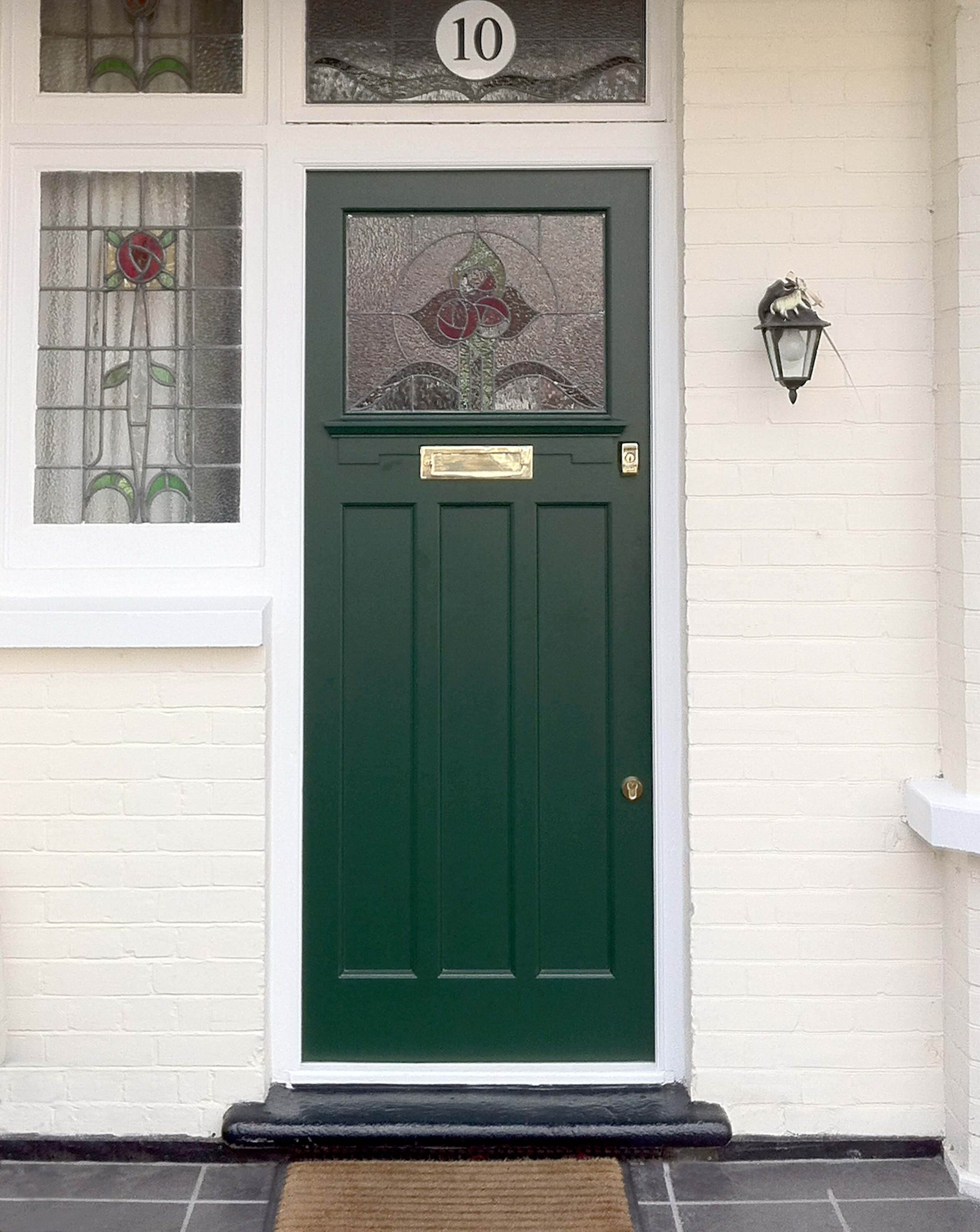 A welcoming 20s/30s door. Complete with frame, fanlight and side light with stained glass detail and brass door furniture. This stylish bespoke door features a joyful stained glass panel inlaid with a finely crafted flower motif. The same design has been carefully replicated in the side light and fanlight which also features an oversized door number. The door is painted in classic British Racing Green.