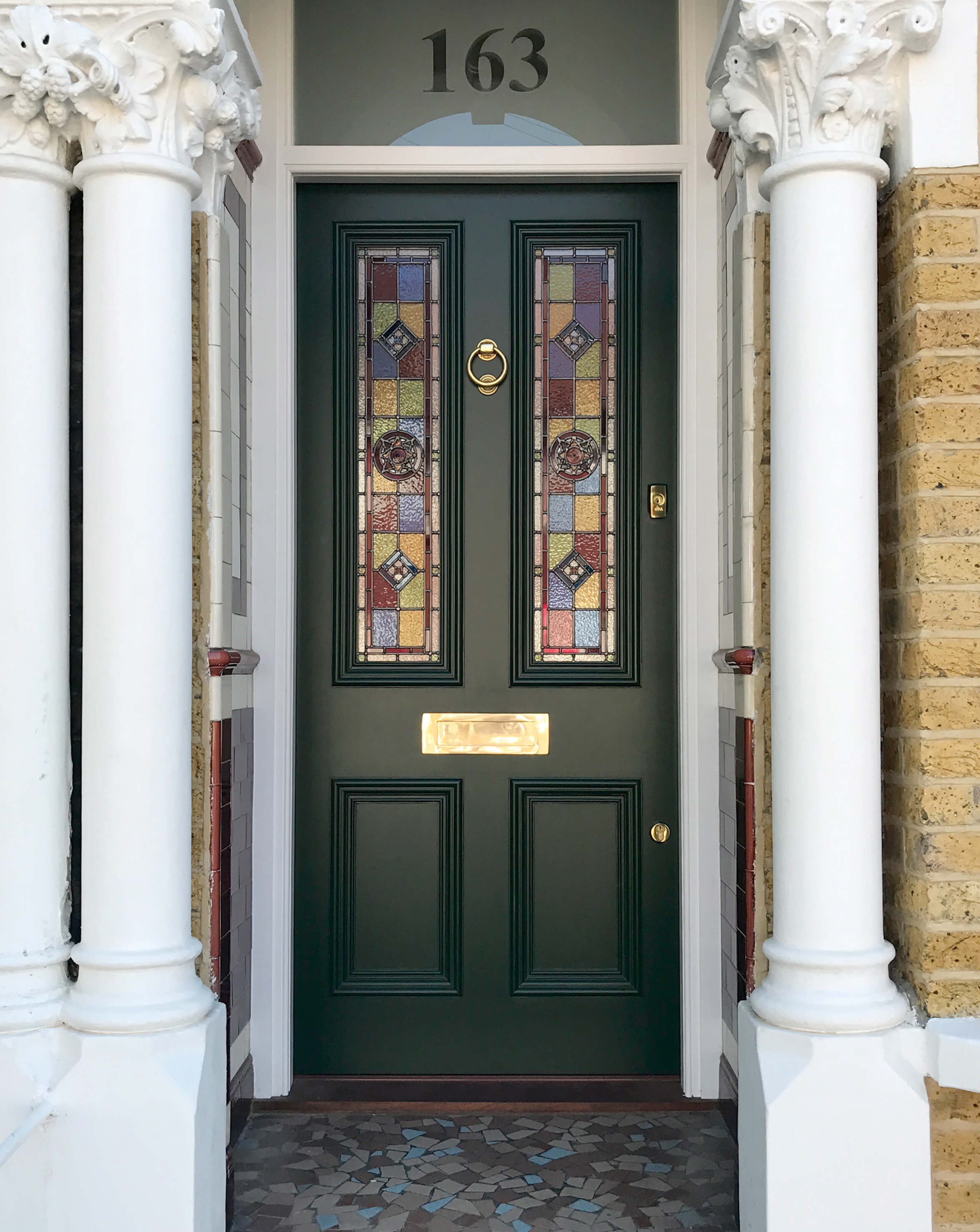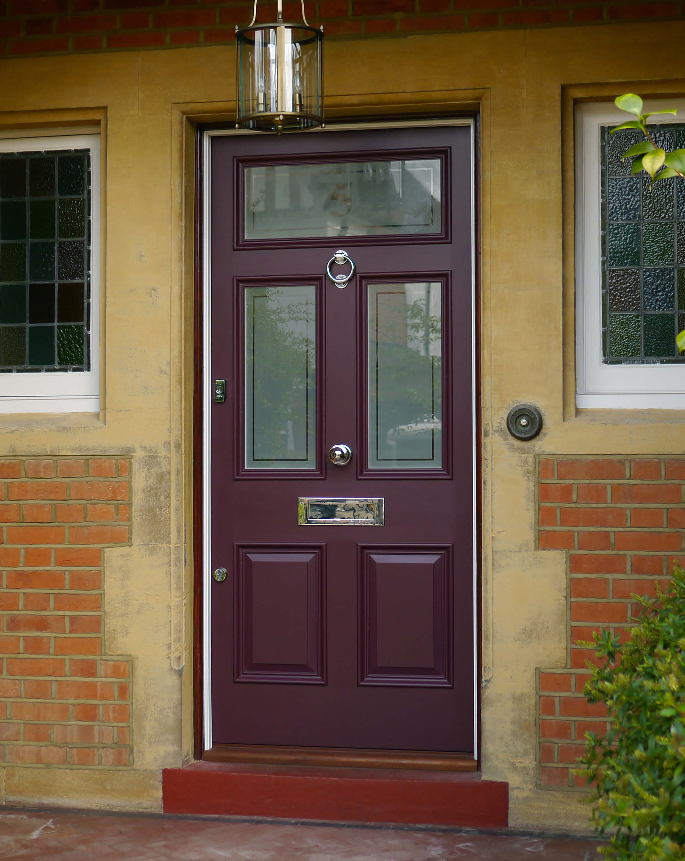 Victorian door with glass panel details and polished chrome door furniture. The owners of this door have selected a deep aubergine finish and classic glass panels. Perfectly installed to fit its original solid stone doorway, the style of this door, and the design of its features chime sympathetically with this period property.