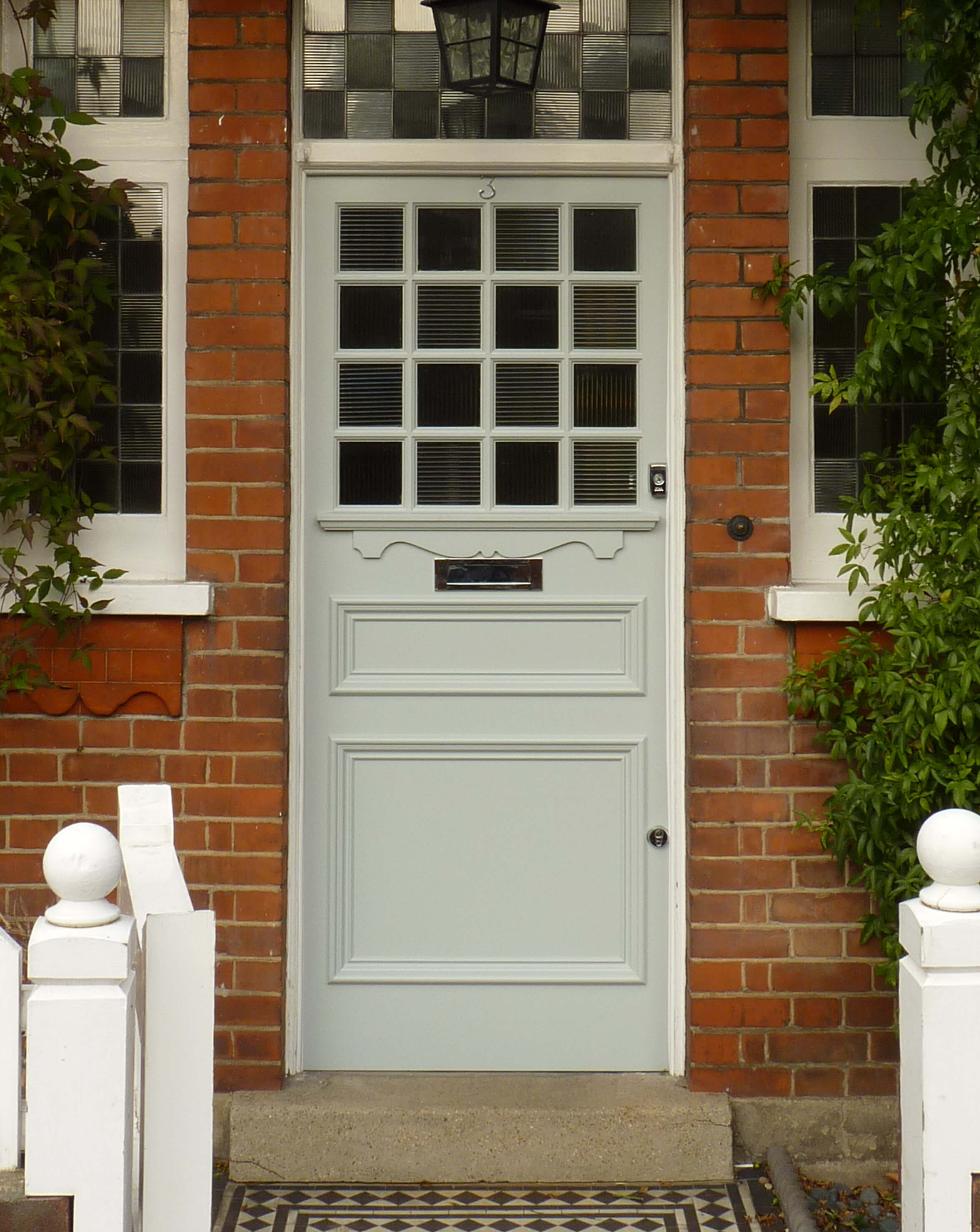 A stunning Edwardian door in heritage grey finish with decorative glass panelling and brass door...