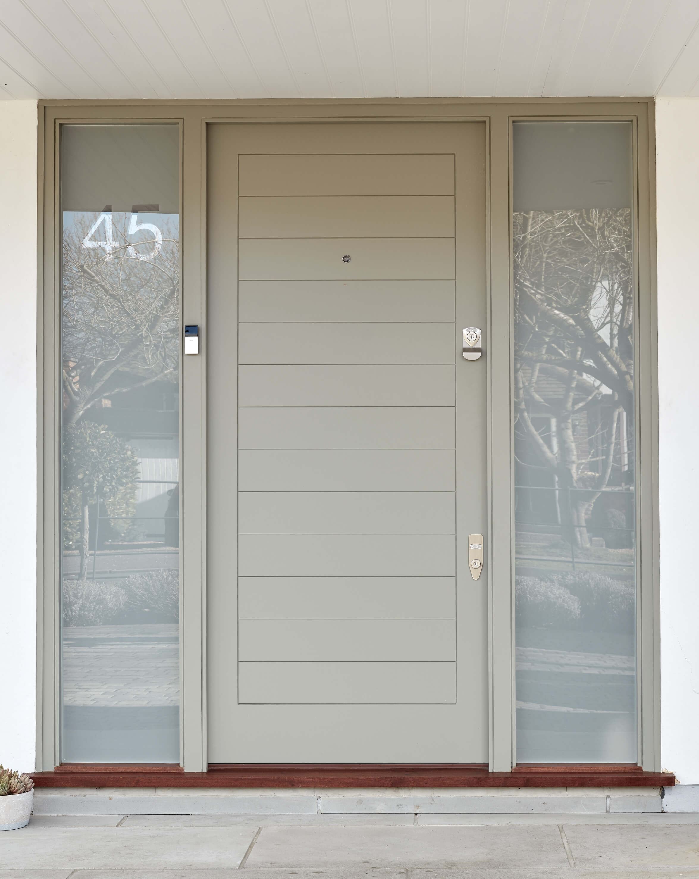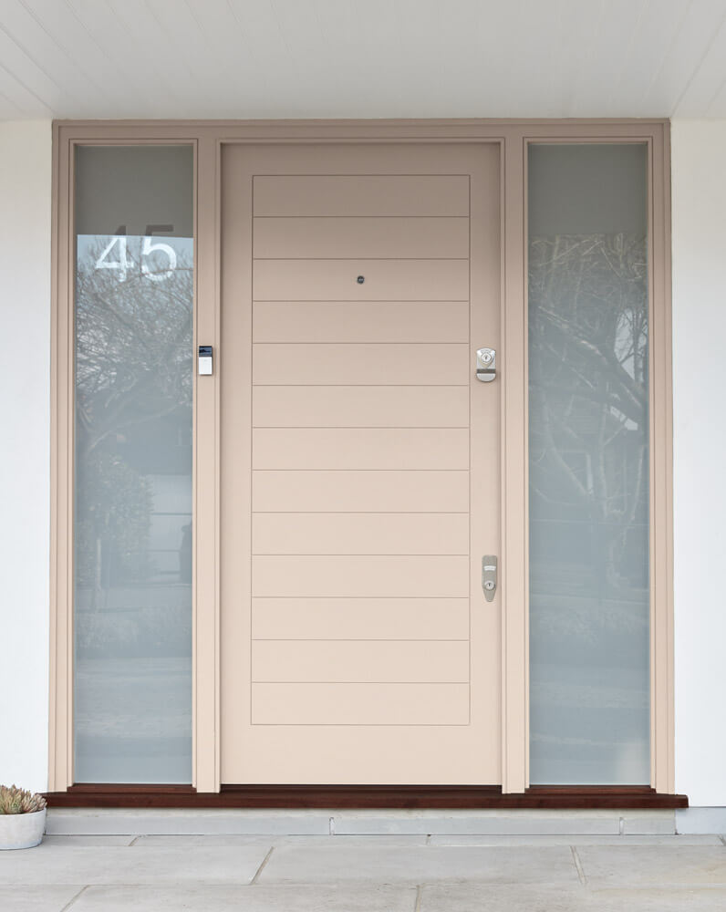 A Contemporary door design with clean, horizontal panels, full-length opaque sidelights and gleaming polished chrome door furniture. The owner of this property has selected a creamy, pale pink shade from our paint range called Milk Thistle. The overall effect of this beautifully crafted and hand-finished modern external door suggests a well-designed and welcoming home that stands out from the crowd in all the right ways.
