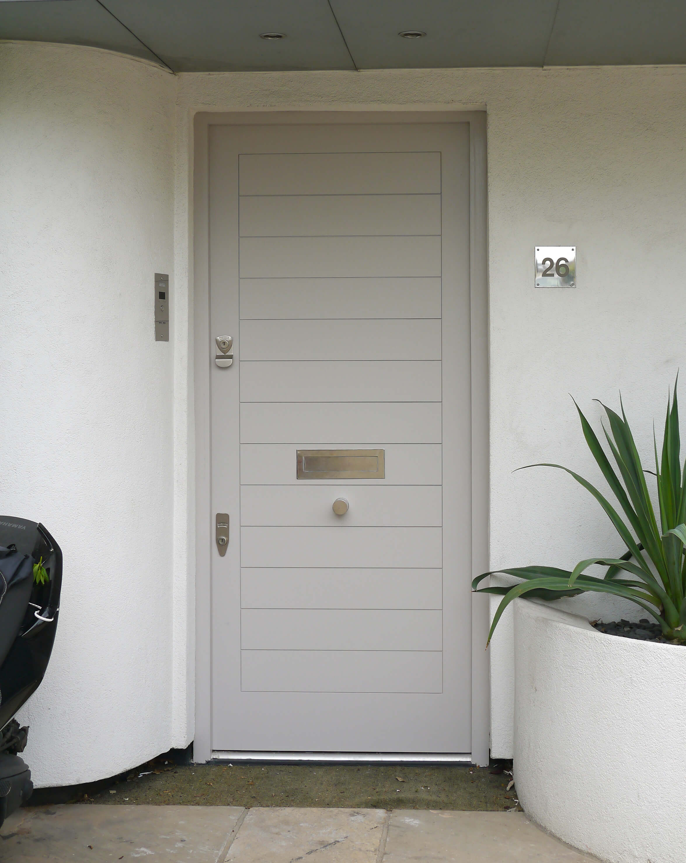 Contemporary door and frame with single sidelight. Painted in a shade of duck egg blue with chrome door furniture. This Contemporary design mirrors the architecture of the porch. The panels are perfectly aligned and the sidelight reflects the porch’s partial glazing. A statement numeral is inlaid into glass to keep accessories on the door to a minimum.