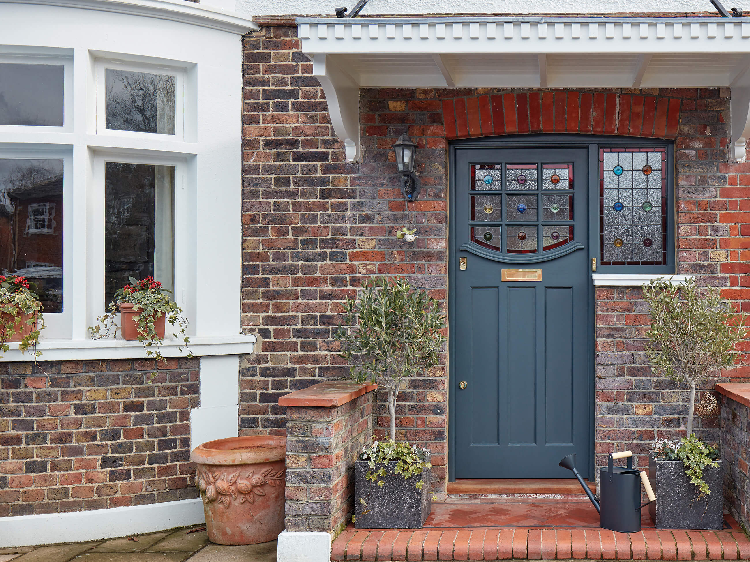 The art deco style of this 1930s grey front door with its stained glass sunburst design characterises the influences of the day. For the first time, having a suntan became fashionable and people enjoyed sunbathing. This led to the building of flat roofs on homes, pergolas and balconies as sun traps. This beautiful door is a typical design of the 1930s and works wonderfully with the architecture of the home. A coat of paint in a shade that is both modern yet reflective of the era gives it a contemporary boost and highlights the vibrancy of the beautiful sunburst design in the leaded glass.