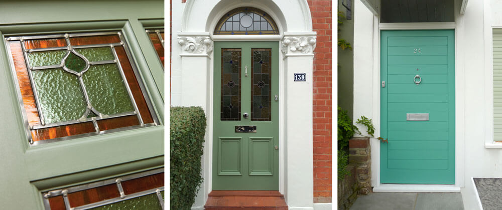 Pink is complemented beautifully with pale whites and brass door furniture creating an elegant yet contemporary look. Depending on what shade of pink you choose these coloured doors can look even more impressive when exterior foliage, roses, blossom or wisteria is present around the doorway.