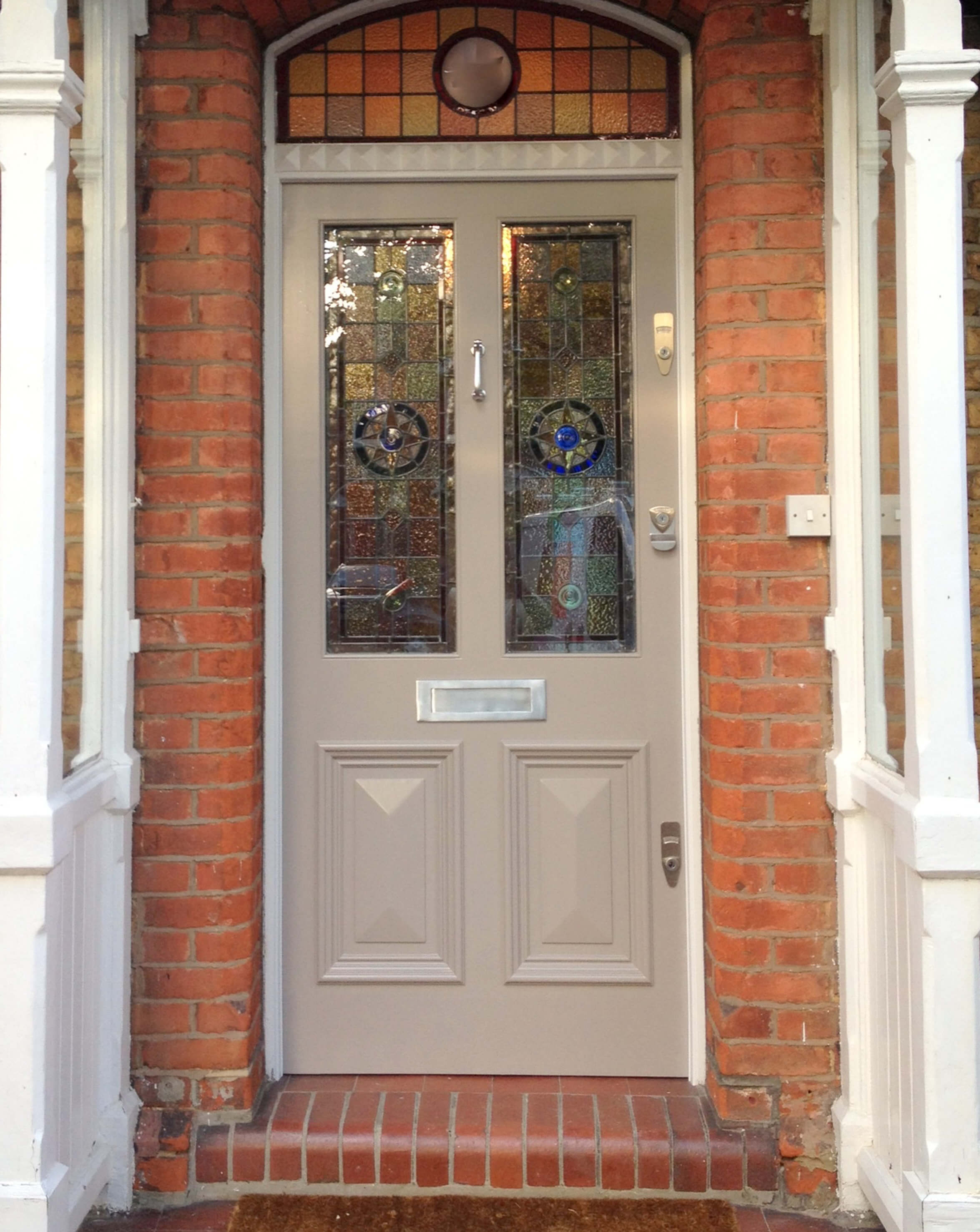 Elegant Victorian door with distinctive stained glass panels and brushed chrome door furniture. As well as the exceptional quality of the door itself, our skilled glaziers can intricately create or restore original stained glass door panels to add extra character to your property.