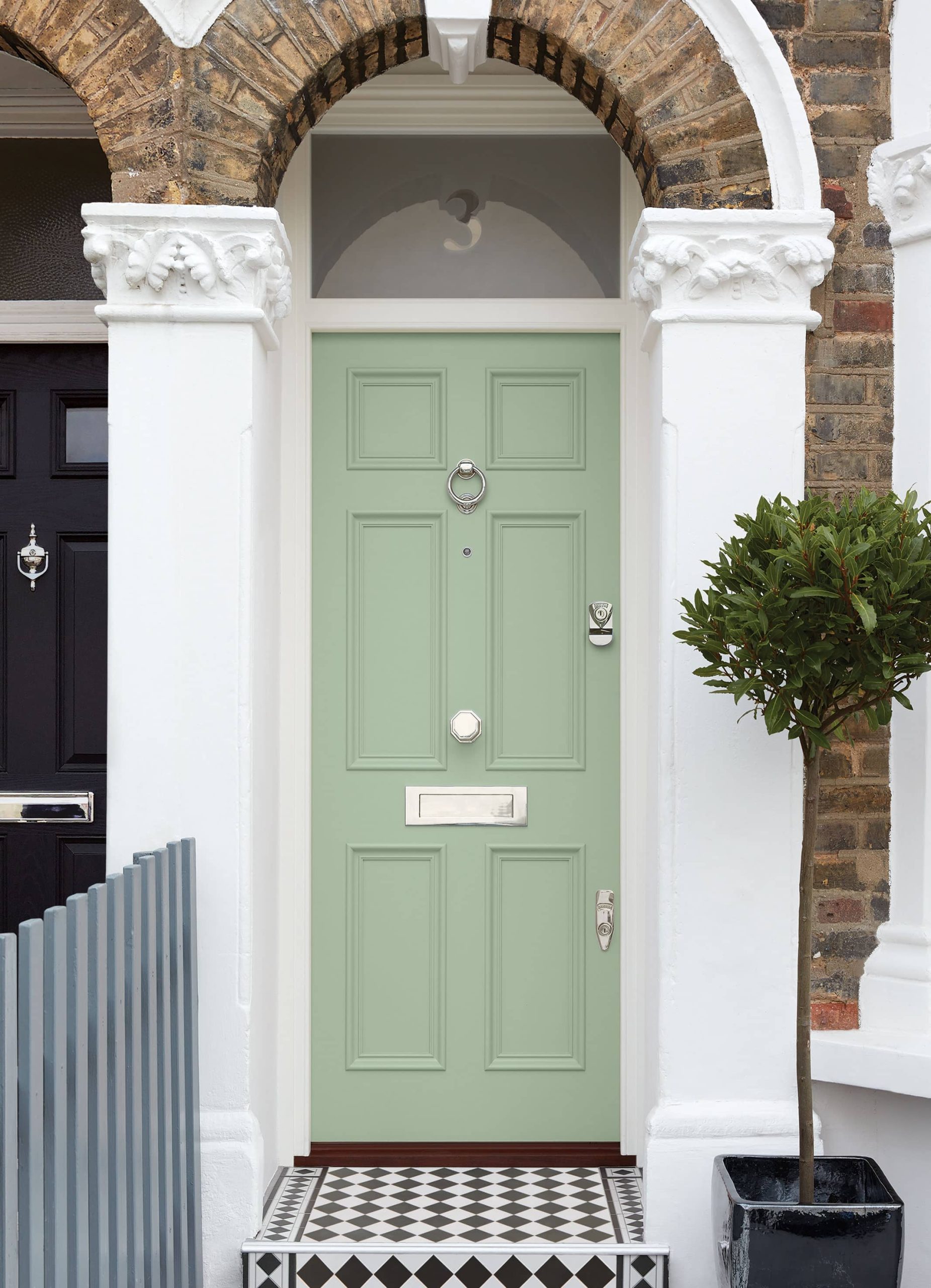 This meticulously made Victorian wood front door in a mint-coloured shade called Prussian Green has six beautifully moulded panels in keeping with its period style. The opaque fanlight has oversized door numerals etched into the glazing; the positioning of the numbers keeps the chrome plated door furniture to a minimum.