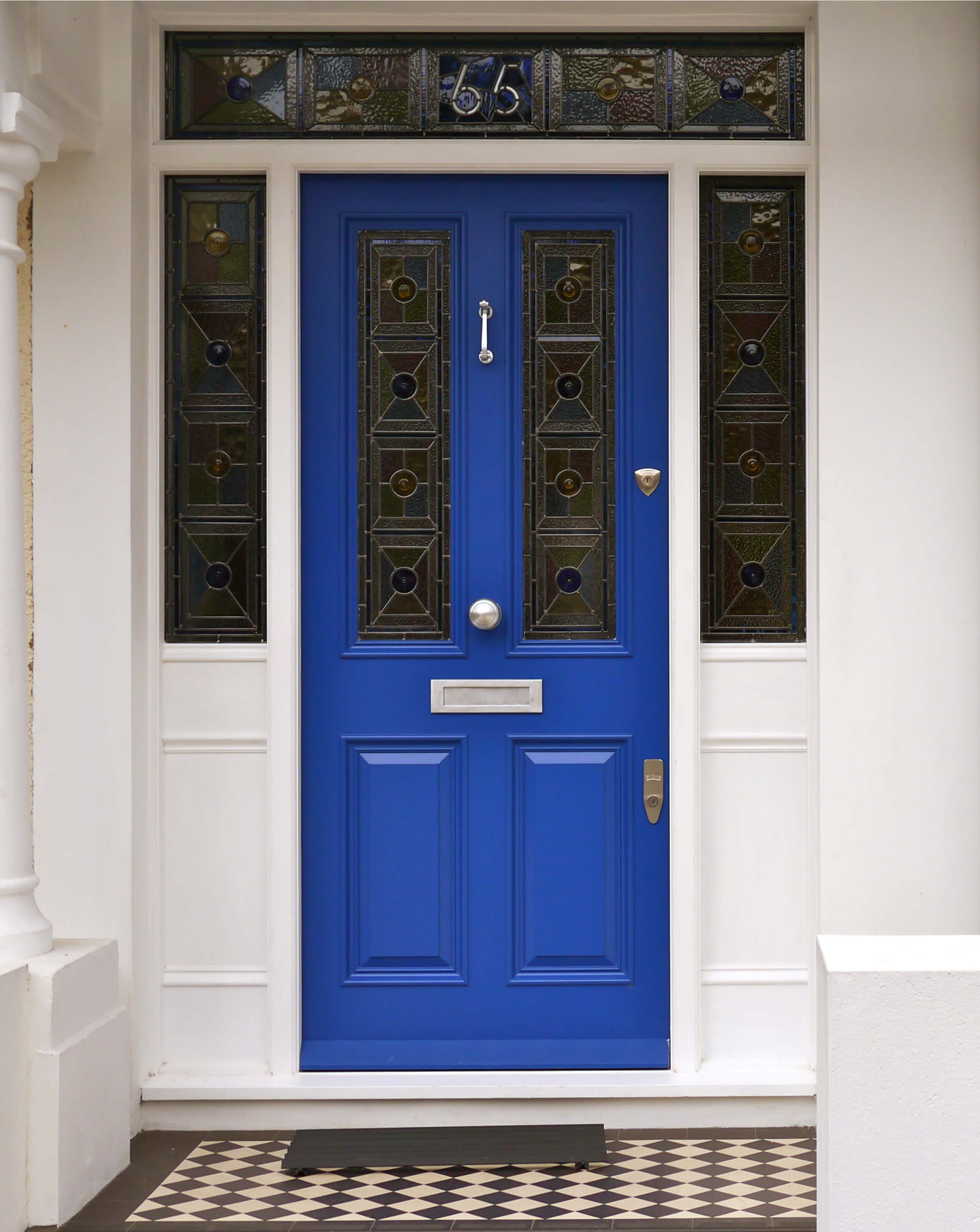 Victorian door and door frame with side lights, stained glass and chrome door furniture. The beautiful cobalt blue finish of this decorative door, is just one example of the range of colours available. Paintwork is perfect for giving your handmade Victorian door style a contemporary twist for ultimate kerb appeal.